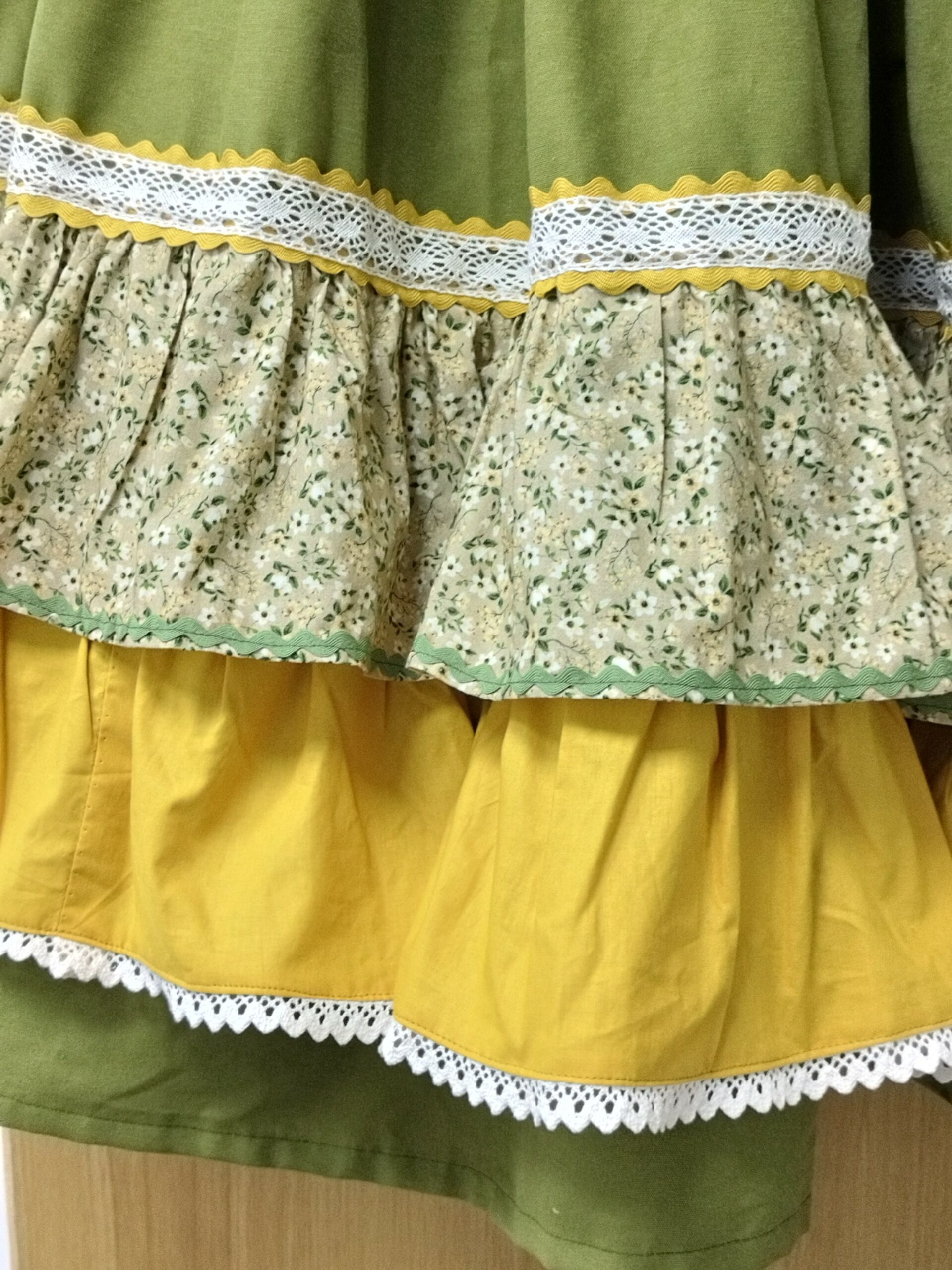 Zagalejo con cintura de tablas confeccionado con loneta color verde hoja composición 70% algodón 30% poliéster de caída sostenida, textura suave con volante estampado y segundo volante color amarillo de tejido 100% algodón. Nuestros montes, espacios naturales llenos de vida y pulmón verde de nuestra región.